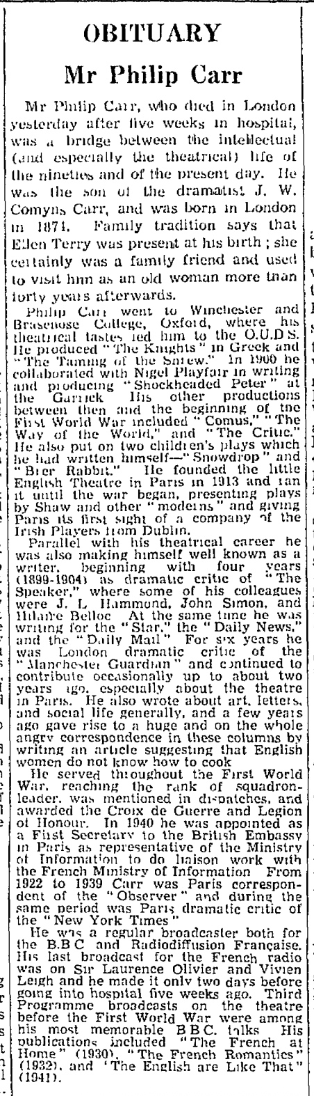 Then there are the earnest people who go every night to the Comédie Française, with an occasional visit to the Odeon, that large and dreary mausoleum where the reputations of so many artistic managers lie buried. If it gives you any pleasure to see translations of English plays in Paris you can find one of The Devil’s Disciple, which has just been produced with moderate success at the Odeon, just as you can also see Mme Pitoeff in Saint Joan at the Theatre des Arts.