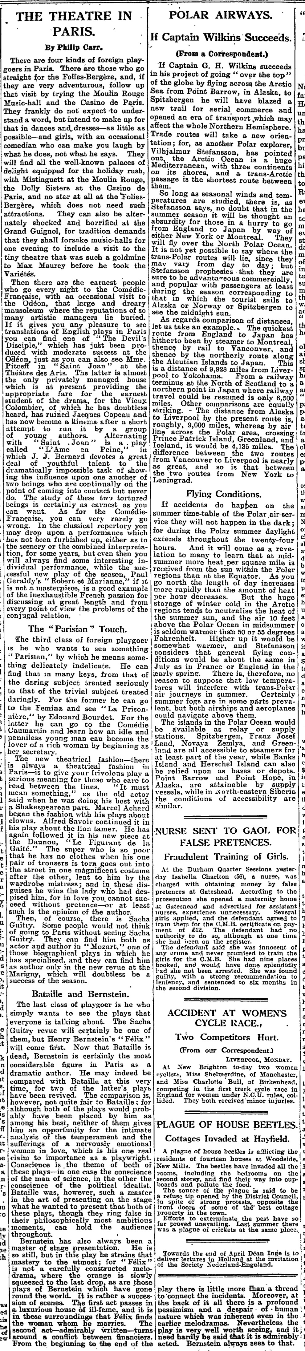 There are four kinds of foreign playgoers in Paris. There are those who go straight for the Folies-Bergère, and, if they are very adventurous, follow up that visit by trying the Moulin Rouge music hall and the Casino de Paris. They frankly do not expect to understand a word, but intend to make up for that in dances and dresses – as little as possible – and girls, with an occasional comedian who can make you laugh by what he does, not what he says. They will find all the well known palaces of delight equipped for the holiday rush, with Mistinguett at the Moulin Rouge, the Dolly Sisters at the Casino de Paris, and no star at all at the Folies-Bergère, which does not need such attractions. They can also be alternately shocked and horrified at the Grand Guignol, for tradition demands that they shall forsake music halls for one evening to include a visit to the tiny theatre that was such a goldmine to Max Maurey before he took the Varietes.
